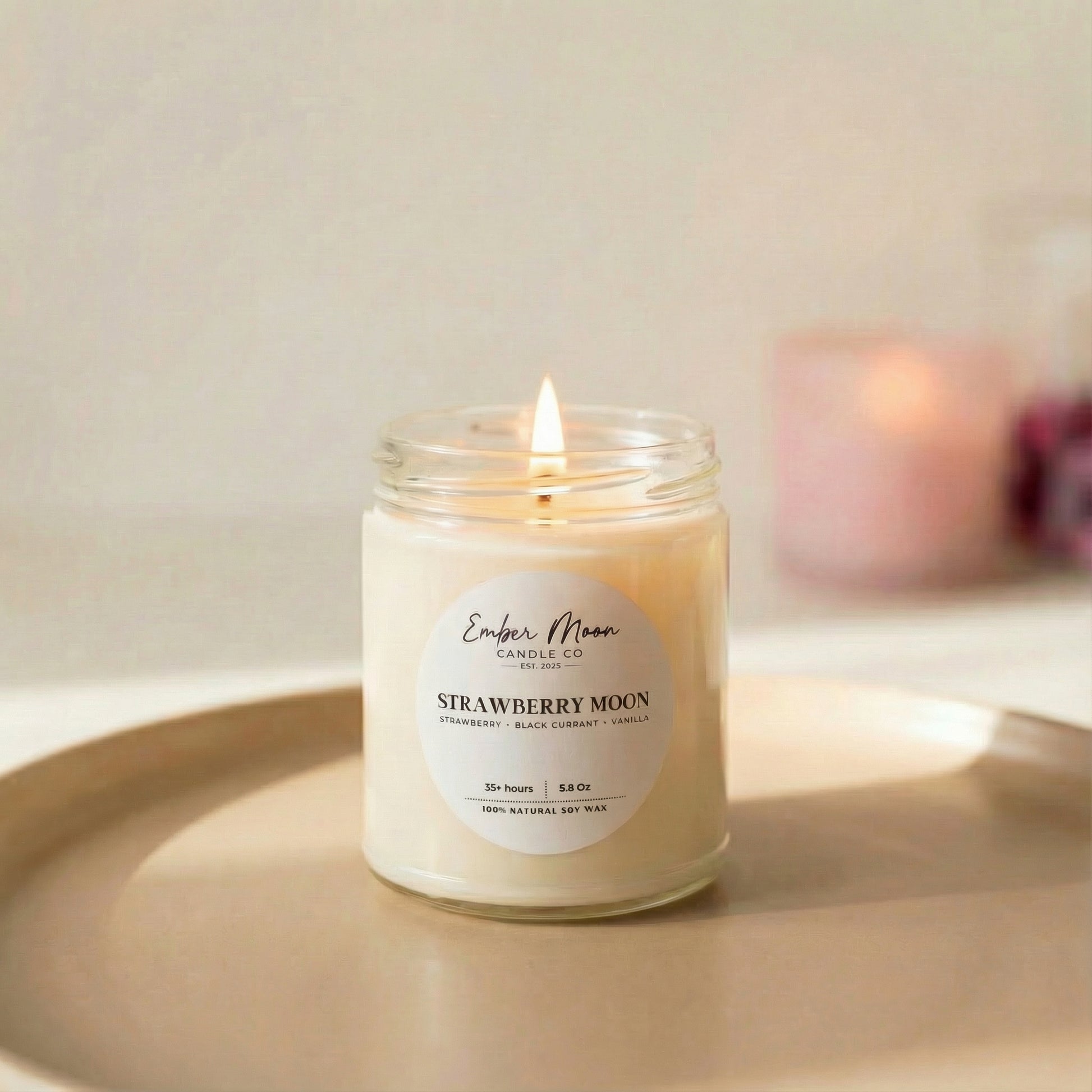Strawberry Moon is a sweetly sophisticated candle inspired by the magic of summer nights and the seasonal beauty of the strawberry moon — a full moon that lights the sky at the peak of strawberry season. Bright notes of strawberry, raspberry, and black currant capture the vibrancy of moon-ripened fruit, while a base of tonka, vanilla, and a whisper of light musk adds depth and warmth.
